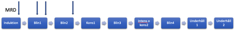 - MRD ≥0.01% efter Blin2. Vid denna tidpunkt bör MRD vara omätbart. Vid mätbar eller kvarstående MRD signal som ej är kvantifierbar rekommenderas diskussion med regionalt ansvarig ALL kollega eller i SVALL gruppen gällande val fortsatt behandling