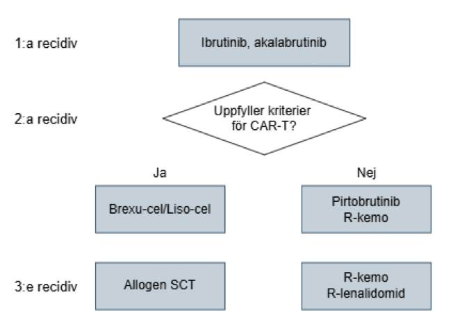 Behandlingsvalet avgörs här av vilken primärbehandling som givits. Vid icke-symtomgivande sjukdom kan exspektans övervägas också vid återfall. Ett nytt alternativ som visat aktivitet även hos patienter med recidiv efter behandling med kovalent BTKi är pirtobrutinib, en icke-kovalent BTK-hämmare 61.