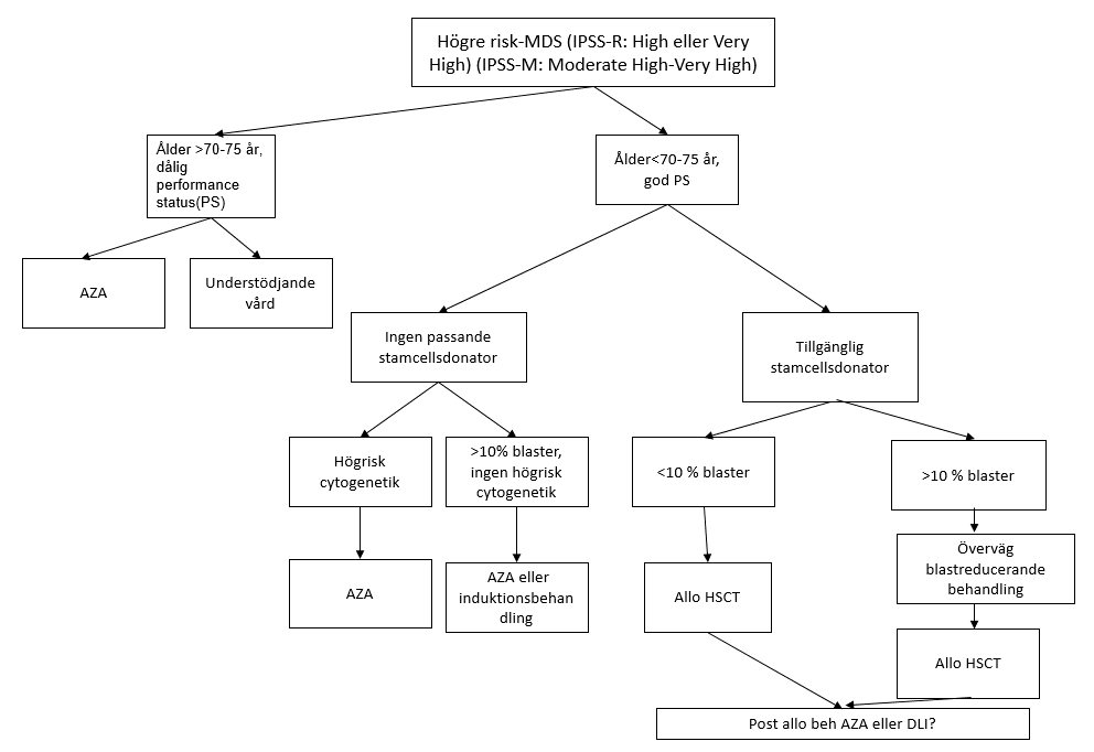 MDS med högre risk har i behandlingsstudier definierats som intermediär-2 och högrisk enligt IPSS och det är på denna indikation som azacitidin är godkänt i Europa. Sedan dess har två nya risk-scores publicerats, IPSS-R och IPSS-M vilka rekommenderas. Vi rekommenderar att man beräknar båda. IPSS-R högrisk och mycket högrisk räknas som högre risk MDS. IPSS-M moderate high och uppåt räknas som högre risk.