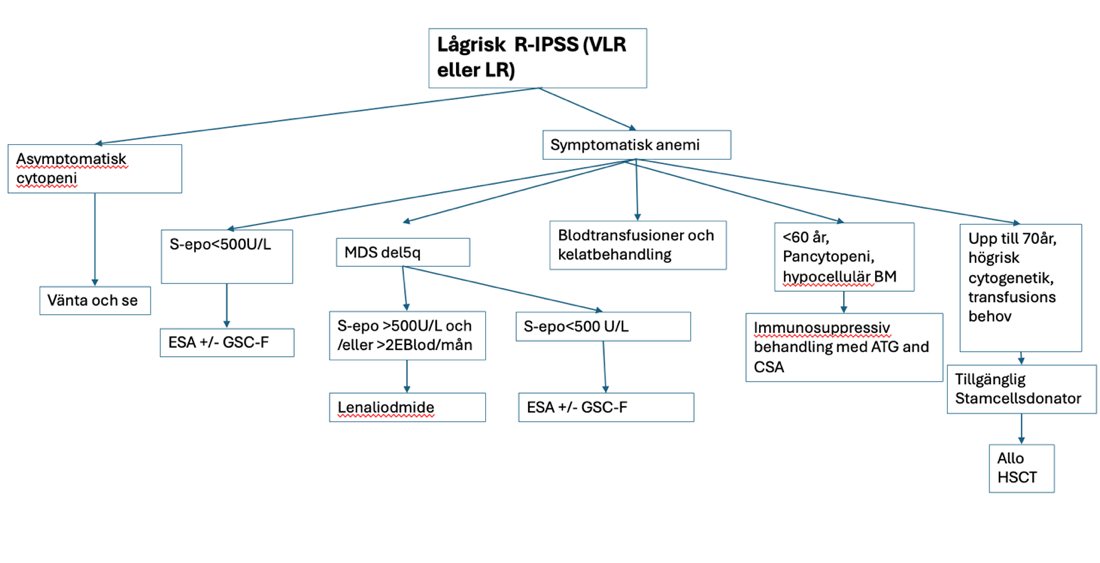 Med lägre risk menar vi enligt IPSS-R Very low eller Low risk. För IPSS-M räknas Very low, Low och Intermediate low som lägre risk. För intermediärrisk-grupperna enligt IPSS-R och moderate-low IPSS-M blir bedömningen individuell, där hänsyn också måste tas till andra riskfaktorer såsom benmärgsfibros, transfusionsbehov,mutationer, samt ålder och samsjuklighet