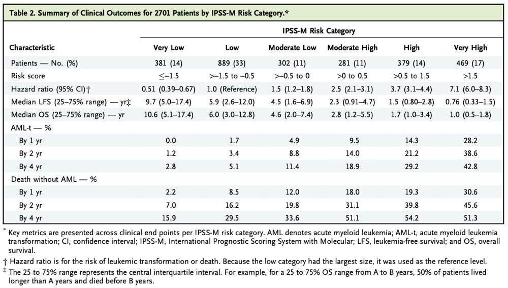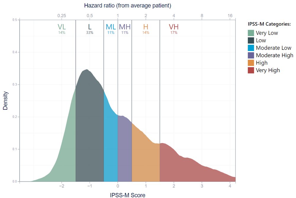 Baserat på IPSS:s variabler, och med tillägg av bland annat molekylära fynd från den diagnostiska NGS-analysen, räknar IPSS-M ut en unik risk-score för den enskilda patienten, men delar också upp patienterna i sex riskgrupper 51. IPSS-M kan beräknas för patienter med leukocyttal < 13 x 109/L men är validerad för s/t-MDS. IPSS-M ledde till restratifiering av 46 % av patienter från IPSS-R (74 % av dessa mot högre riskgrupper och 26 % mot lägre riskgrupper vid restratifiering från IPSS-R till IPSS-M).