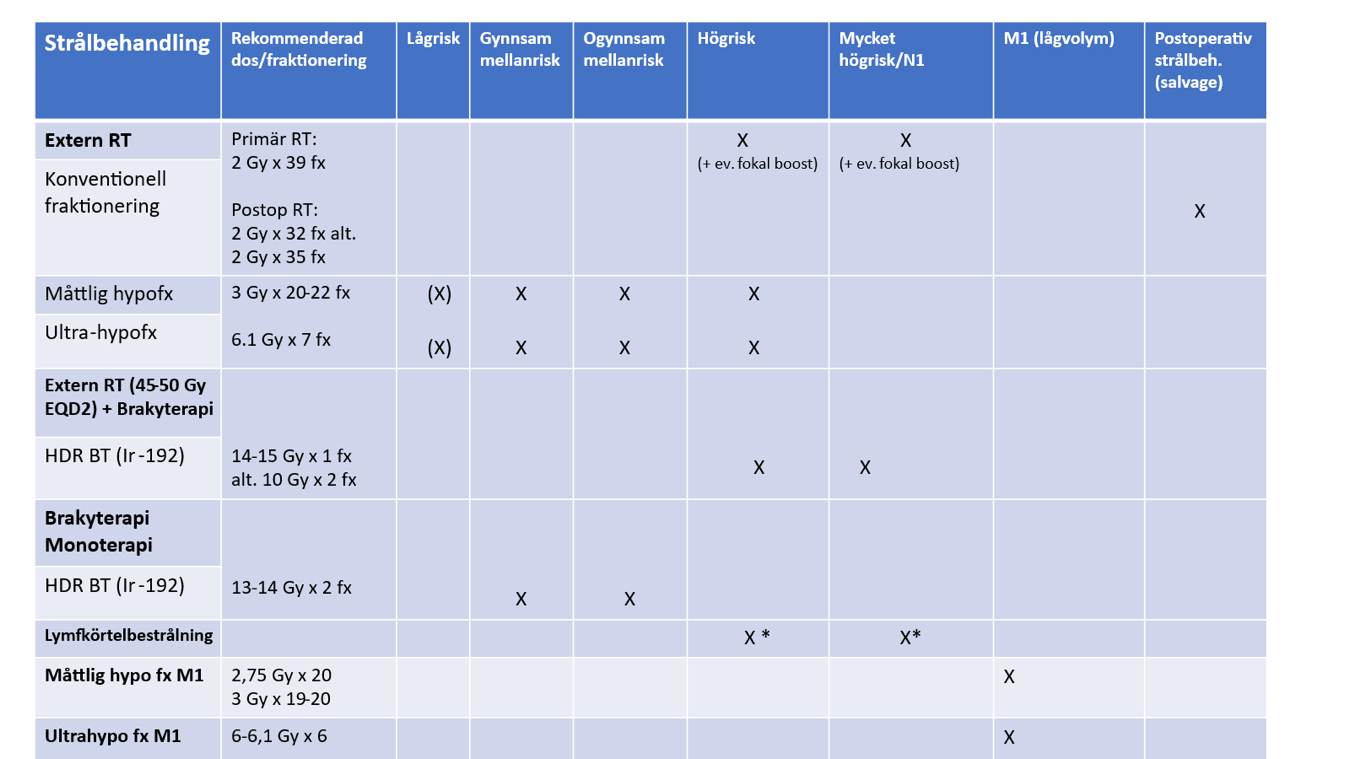 - För undergruppen med minst två av följande riskfaktorer: PSA ≥ 40, T3–T4 och Gleasonsumma 8–10, bör strålbehandling kombineras med hormonbehandling, inklusive 2 års abirateron.