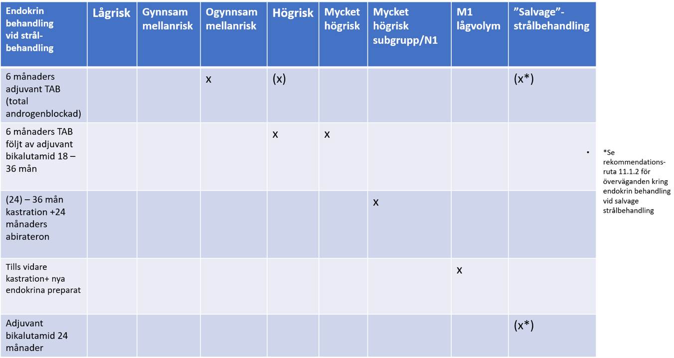 I tabell 5 sammanfattas rekommendationer för neoadjuvant/adjuvant hormonbehandlingsregim vid strålbehandling i förhållande till riskgrupp och N/M-stadie.
