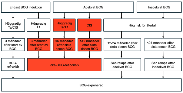 BCG-behandling (induktionsbehandling och underhållsinstillationer i minst ett år) bör ges vid tumörer med intermediär till hög risk för progression (TaG3, T1-tumörer och Tis) (⊕⊕⊕⊕).